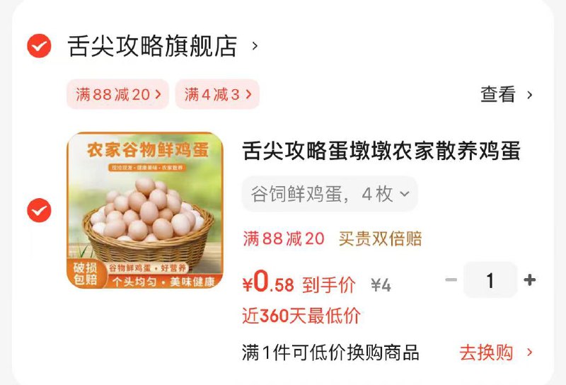 0.5元左右 舌尖攻略谷饲鲜鸡蛋 4枚