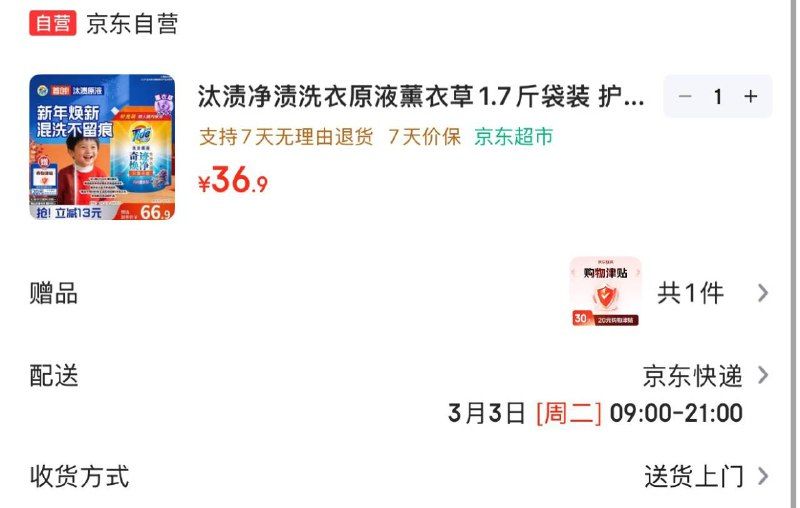 🚦 汰渍洗衣原液1.7斤💰36.9
